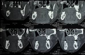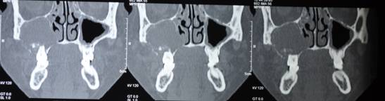 C T SCAN CORONAL AND AXIAL SECTION SHOWS EXTENT OF DEFECT AFTER RESECTION