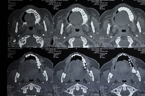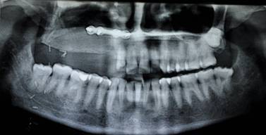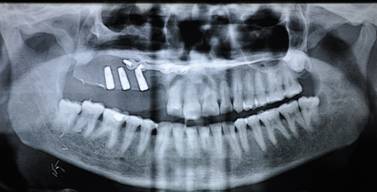 OPG SHOWS RECONSTRUCTION OF MAXILLA WITH OSTEOMYOCUTANEOUS ILLIAC BONE GRAFT AND IMPLANTS